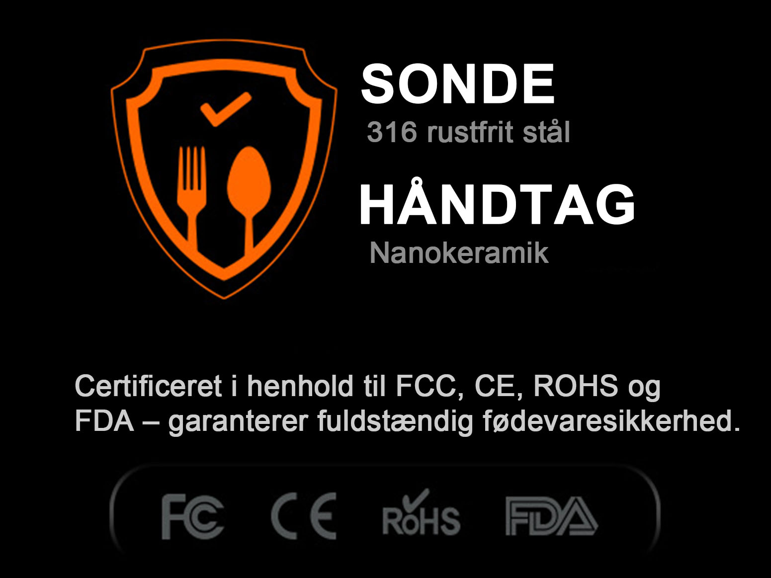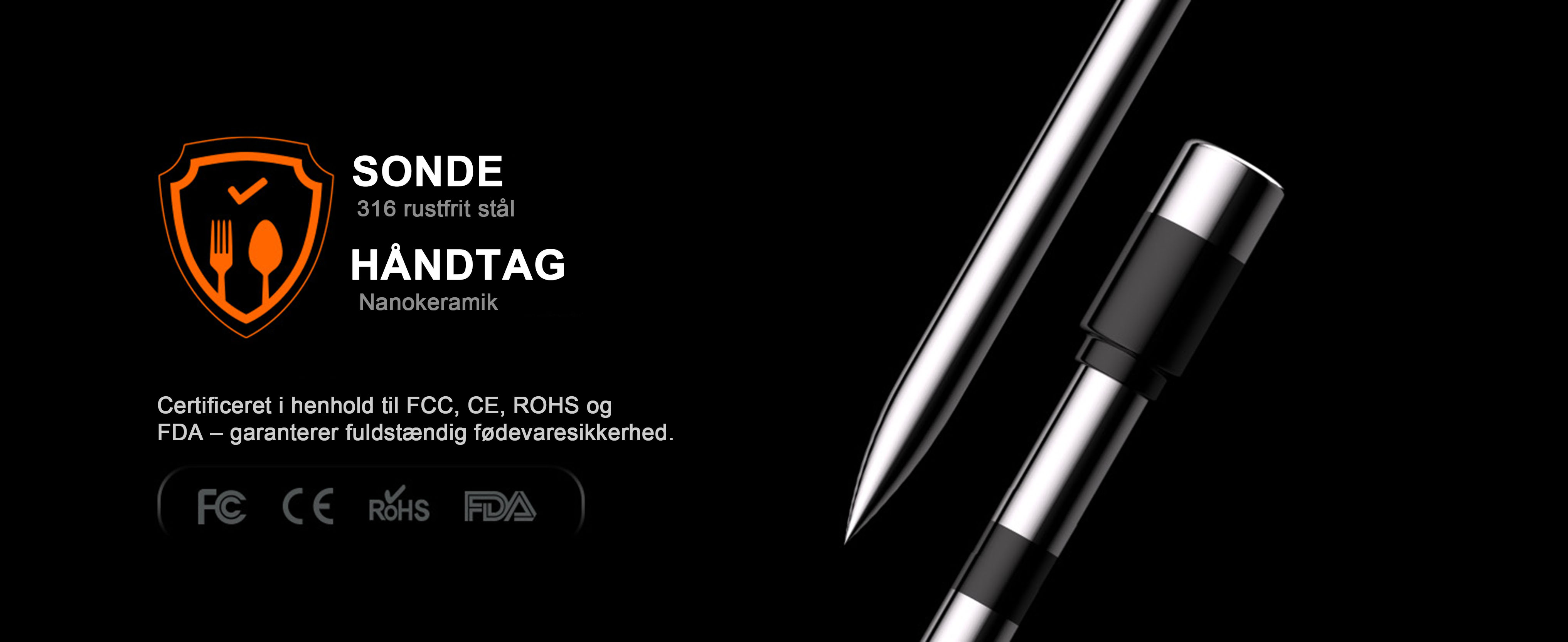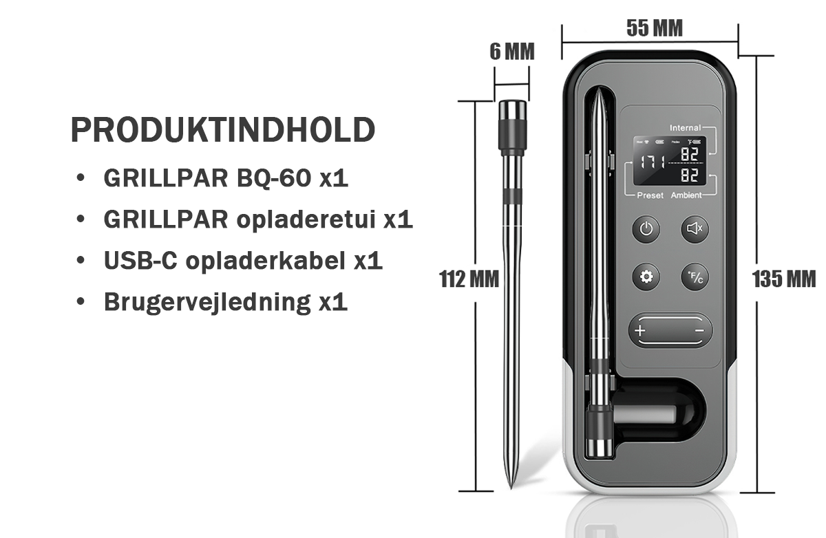 - Præcis måling: 304 rustfrit stål-probe med mindre end ±1°C afvigelse, sikrer perfekt tilberedning af kød, fisk og meget mere.